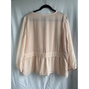 This Loft baby pink peplum top in size large is a stylish addition to your wardrobe. The top features a polka dot pattern, 3/4 puff sleeves, and a relaxed fit. The V-neckline adds a touch of elegance to the blouse, making it perfect for any occasion. Made of high-quality polyester material, this top is soft, comfortable, and durable. The color pink adds a feminine touch to the blouse, making it perfect for women of all ages. This basic style top is perfect for any casual or formal event.