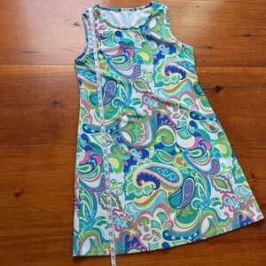 Colorful sleeveless dress, paisley pattern. Excellent used condition- looks new except for brand label cut out. Guessing size is a M/L but please see pictures for measurements. Nice stretchy material fun for any occasion.