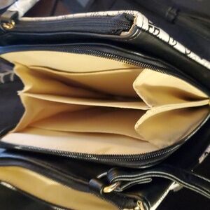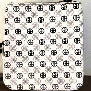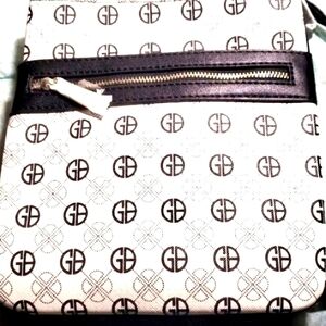 Giani Bernini Signature Crossbody. White and black and all plastic stll on zipper pulls. Has outside zipper pocket, on back of that non-zipper pocket, 3 other zipper compartments, middle is separated into two sections with 2 additional side pockets lots of room. 8 x 7 3/4. Has one minor call out pictured on inside of center pocket. NWOT. Can be Crossbody or shoulder. Pictures don't do it justice. Seems to be sold out everywhere I looked.