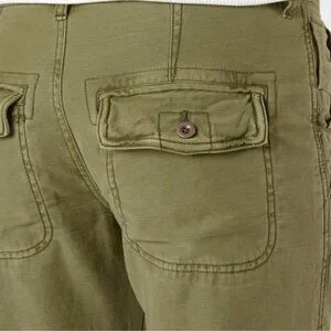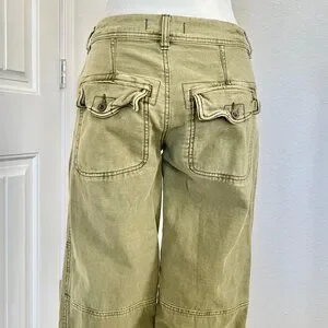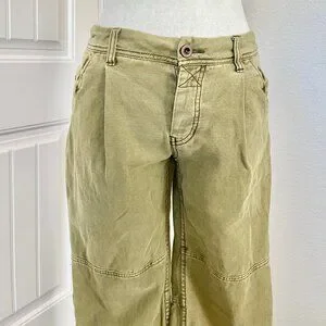 Elevate your wardrobe with these trendy Free People high-rise button-fly utility pants in a beautiful moss green. These are perfect for any occasion, whether you're traveling, going to work, or just running errands. The relaxed fit and tapered leg style provide both comfort and style, while the pleated front and rear flap pockets add unique accents. Made from durable cotton canvas fabric, these pants are easy to care for and machine washable. The utility design features multiple pockets, making them practical for everyday wear. They are size 25, with a 9.5" mid-rise waist, and 28-inch inseam. The versatile design can be dressed up or down, making them a great addition to any wardrobe.