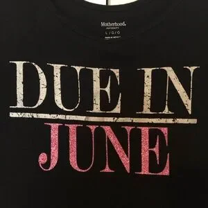 Showoff what's to come in this Motherhood Maternity Due In June™ Maternity Graphic Tank Top. Scoop neckline, Pullover style, Solid ribbed knit with 'Due in June' printed text at front, Fitted, Wide straps. Black with message in white and pink glitter. Size Large.