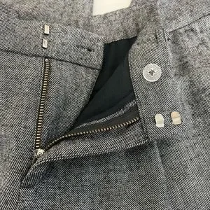 Menswear inspired trousers in a soft wool blend with two front pockets and two back pockets that are still tacked closed. Front pleats,belt loops and zipper with hook and eye and inside button closure. Tapered leg and slight elastic at waistband.