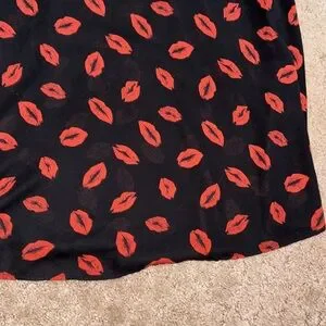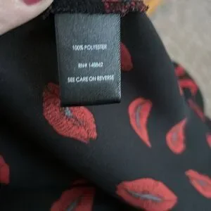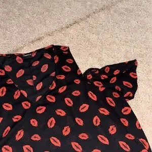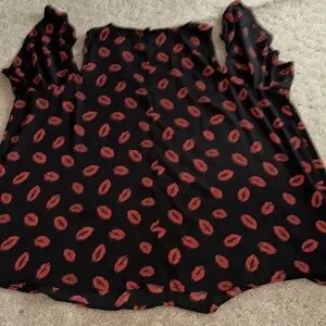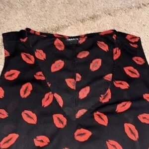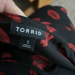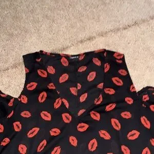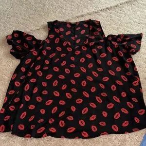 Plus Size Torrid Cold Shoulder Blouse. Size 3X. V neckline, free flowing, no stretch, open shoulder with cap sleeve, black with red lips. Comes from a smoke and pet free home. Good condition, no snags, spots, holes. See pictures for sizing and fabrics.