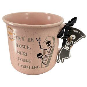 The solid color pink mug features 2 skeletons in a coffin with a text that says "Get in Loser, We're Going Haunting".