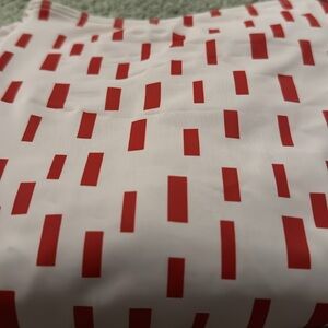 Kortni Jean high waisted maternity bottoms. Dashes are a brick red with a light pink background. No flaws seen.