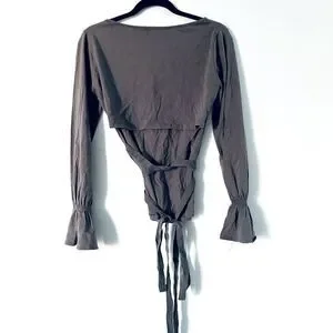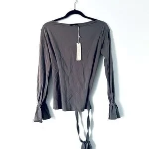 Mustard Seed Top Gray Blouse Open Cut Out Tie Back Ruffle Boho Long Sleeve