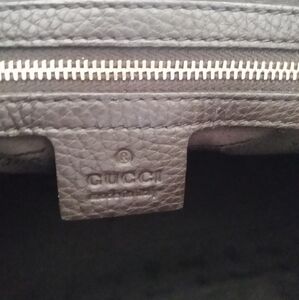 Features: Calfskin grain leather. Rolled leather shoulder straps. Signature Gucci Sherry Web Green & red Web stripes. Gucci embossed buckle snap front closure. Light gold hardware with adjustable buckles at sides. Spacious interior with pockets & authenticity tags inside. Metal feet on bottom for protection. Includes original xl Gucci dust bag.