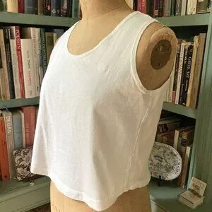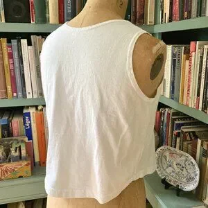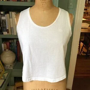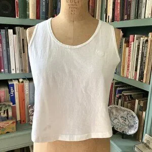 100% cotton, easy care, in white. Marked a size Small; but shown here on a size 12 mannequin, and it fits. Embroidered logo on upper left chest. Curved hem, higher on the sides. Excellent condition.
