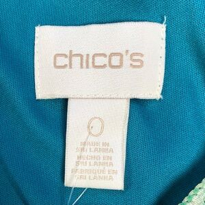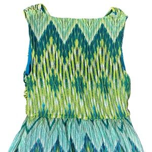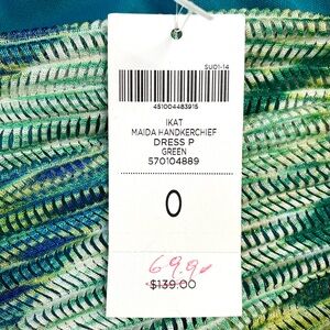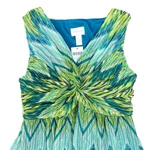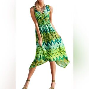 This Chico’s women’s green Ikat Maida Handkerchief dress is sleeveless with a v-neck. It is fun with vibrant colors and a flowy hemline. NWT