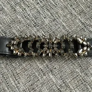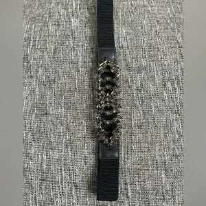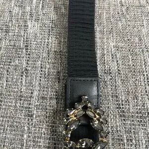 Beautiful dress belt( stretch), back snaps! Awesome front grey crystals “buckle” with gold. Leather detail! Belt:1.25” In like new condition! Great accessory for any dress or pant!