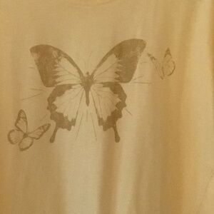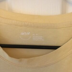 This shirt has only been worn once. It is an oversized distressed fabric with a trendy wash. Tagless label for comfort and lightweight cotton fabric. It is a long t shirt and oversized for comfort. Size is small ( I usually wear med or lg) color is yellow.