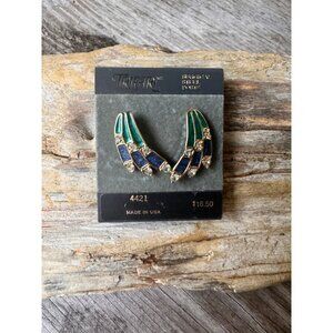 Vintage Trifari Blue and Green Enamel Rhinestone 'Wing' Earrings are marked Trifari and are circa the 1980s. They are gold tone and shaped like wings or comet tails in blue and green enamel with rhinestone accents.Earrings measure approx. 1 1/8" X 5/8"