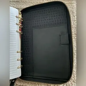 Black leather Kate Spade Agenda/Planner with original planner sheets from 2018. Not sure if this is real leather, zipper is smooth. There are a few small scratches on the leather but not that big of a deal. I tried to get pics but they are not showing up very well. Has the pen holder loop in the back. Good condition, lots of life left to this planner.