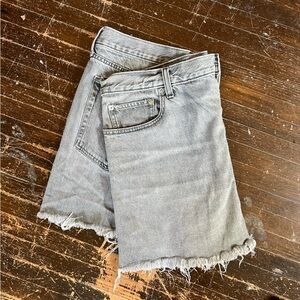 Flattering high waisted shorts in a mom-short style, with button fly and raw cut (intentionally frayed) hem. Approx 1” finished/stitched side slits provided a flattering shape and flare. Gray denim - very soft with relaxed fit. Shorts were factory distressed, so possible very light wear - but no visible defects. Perfect summer short and transitional to warmer fall weather!