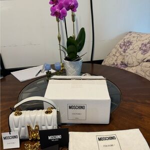 Beautiful NWT Moschino mini purse. Comes w dust bag, docs and outer mailing box. Measurements: approx. 6x4x1.5