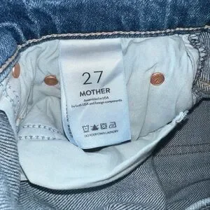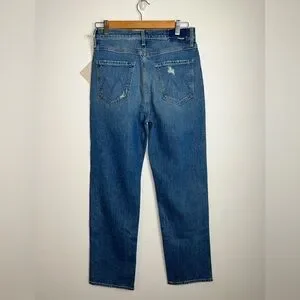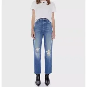 MOTHER SUPERIOR High Waisted Study Hover Jeans, NWT, Size 27, Wash-Something to Reveal. 90s-inspired straight leg with a high rise and clean hem, crafted from semi-rigid superior denim, classic mid-blue wash with whiskering, fading and torn knees, intentionally distressed accents, 98% cotton, 2% elastane.