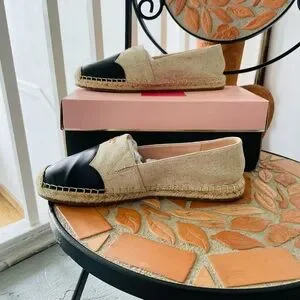 🍀KATE SPADE Garden Black Leather & Natural Canvas Espadrilles