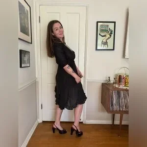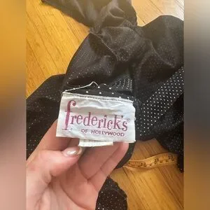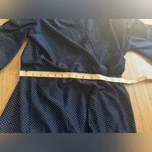 This is a gorgeous late 70s early 80s dress made by Fredrick’s of hollywood. Made of a black stretchy poly with tiny white polkadots, the dress is faux wrap style with a low cut neckline. The skirt of the dress has ruffles and the sleeves of the dress are puffed and 3/4 length. The dress is marked a vintage 13-14 with measurements included in photos - about a medium. Overall in good vintage condition with no major flaws to note.