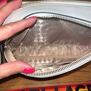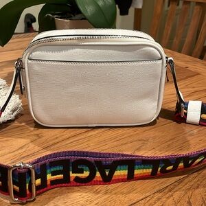 Beautiful Karl Lagerfeld White Crossbody Purse With Rainbow Thick Adjustable Strap. Silver Hardware. Two Zipper Sections. Comes With Love Letter.