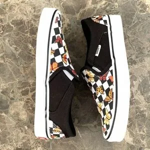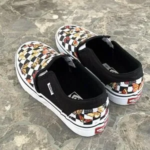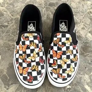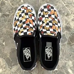 New with box-No Lid, A cute pair of slip on Vans Asher shoes Checkerboard with butterflies all over. Canvas uppers. Fantastic everyday shoes.