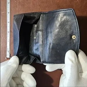 Chanel CC Logo Caviar Lambskin Bifold Wallet with button latches, coin purse, 6 card slots and bill slots. Very slim and very functional!