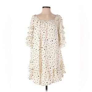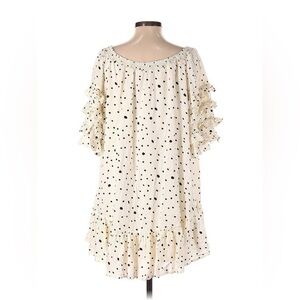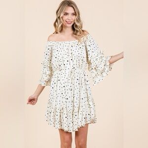 Vici Off The Shoulder Dotted Ruffle Detail Mini Dress with self tie belt. In great preowned condition. Pullover style, unlined. Flouce hem and ruffled sleeves.