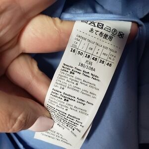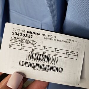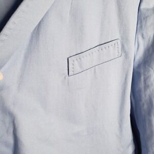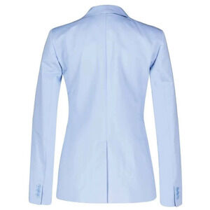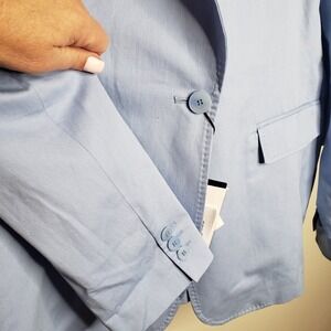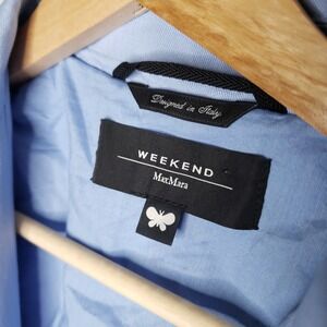 New with tags Weekender Max Mara Cotton twill blazer in ladies size 16. This is a classic staple must have versatile blazer. Comprised of cotton and linen with Handstitching along Lapel, pockets and front. Single button closure and back vent. Comes with spare buttons and tags attached. MSRP $476. This blazer is in Azzurro (sky light) Italina size 50 translates to US size 16. Italian made to highest standards. Measures 21" Pit to pit and 28" in length. Sleeve length from ball of shoulder 25.5". Features usable front lower pockets as well as left chest pocket.