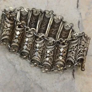 A very old Vintage sterling silver fligrie statement panel bracelet. This piece very well could be antique but I don't have proof. Please see all pictures and the video for details .