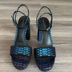 NEW in original box Vince Camuto Pendry ankle strap snake embossed chunky heel sandals are perfect for multiple occasionsz the ankle strap provides elegance while the chunky heel provides comfort and mobility. The shoe appears blue but under certain lighting provides a purple iridescent look.
