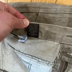 90’s / Y2K Girbaud Brand X Authentic Fit relaxed jeans in light khaki / tan wash with whiskering. Tapered leg. High rise. Zip fly. Slash pockets, plus an extra pocket by the knee. Great vintage condition.
