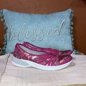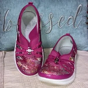 Casually worn Bzees women’s comfort shoe in size 9 - fun pink pattern with bungees that sparkle! Best comfort shoe available in my opinion for anyone who is either working on their feet all day or on the go all day. Fun and comfy!