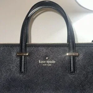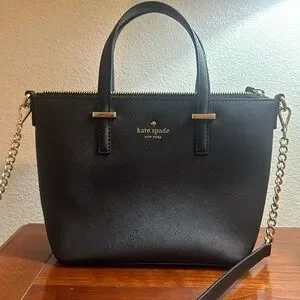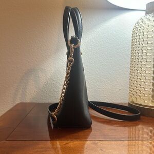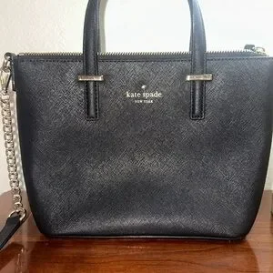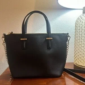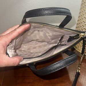 Black, crossbody bag. Removable strap. Good detail. Two pockets on the interior. One interior pocket zips. The bag itself has a zippered closure.