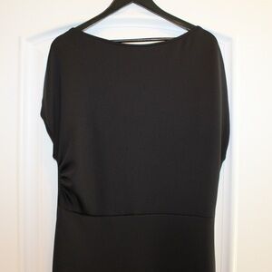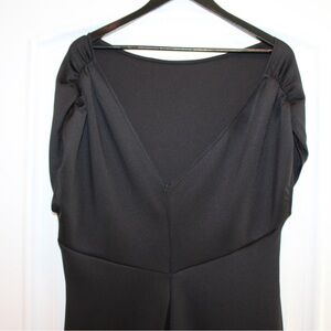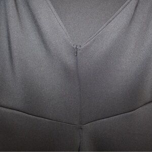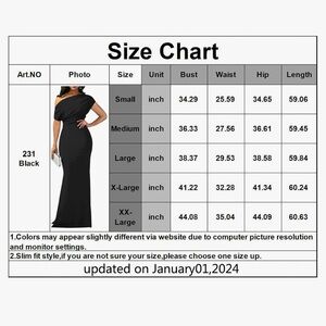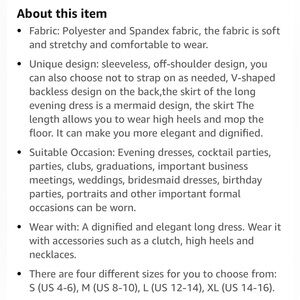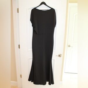 Black gown from Amazon, zippered back, mermaid bottom, heavyweight material, material provides stretch, women’s size XL (although there is not a size tag inside of the gown), measures approximately 60” from top of shoulder to bottom of gown, can be worn on one or both shoulders, worn once for a formal wedding, in excellent and like new condition.