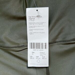 These leggings are full length; inseam measured lying flat is approximately: 27”. Super stretchy fabric (71% polyamide/29% elastane; lining is 85% polyamide/15% elastane) that is sweat-wicking and quick drying. High waisted: rise measured lying flat is approximately: 13.5”. All-over gloss makes these leggings stand out! Gorgeous dark green color (“Dark Forest Green”).