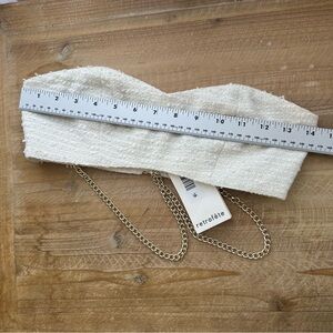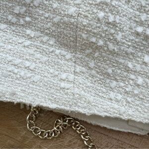Our tweed Loris Bra is anything but business as usual. This bralette features a sweetheart neckline, metal chain detail, no-slip interior trim, and exposed metal zipper at center back. Wear it with our Elfie Blazer and Medina Skirt for a bold co-ord look. Shown here in White