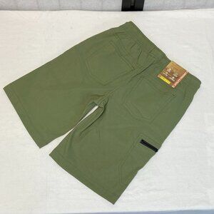 Youth Athletic Tech Cargo Shorts from Weatherproof Vintage. New with tags. Lightweight parachute type stretch knit in solid khaki green. Regular fit with tapered leg. Slant pockets on front with back patch pockets. One additional utility zip pocket on leg. Elastic waistband with drawstring tie. Hits at knees.
