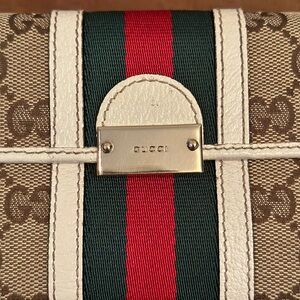 Gucci Ivory Leather/Canvas Monogram with Sherry Line Bifold Long Wallet