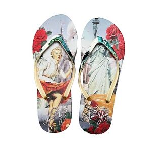 ✨ Features: Slip on flip flop sandals with vintage graphic design. Left sandal has a graphic design that includes a vintage pinup in front of the Empire State Building and roses. Right sandal has a graphic design that includes the statue of liberty and roses. Both sandals also have "New York" printed on them in the heel area. ]