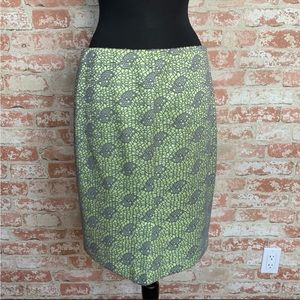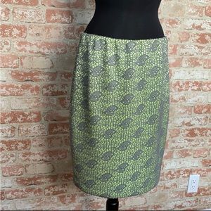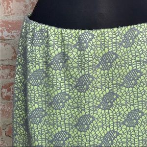 Mossimo pencil skirt with elastic waist. Delicate gray crochet atop pistachio green background. Slightly stretchy. Length hits at/below knees.