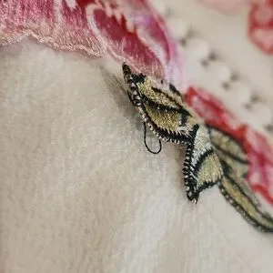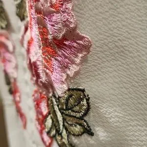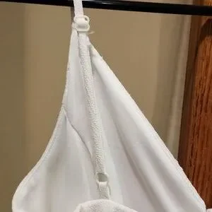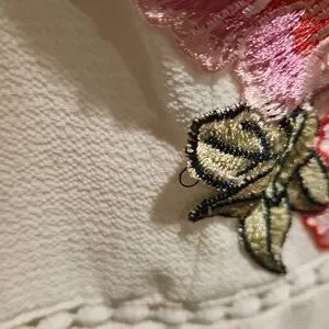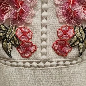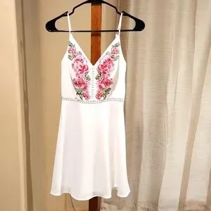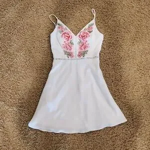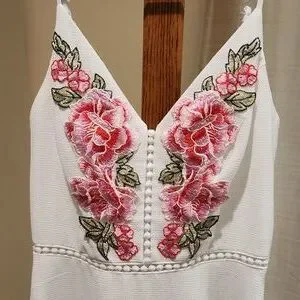 very cute white dress with pink/red flow applications on top. spaghetti straps whichbare adjustable to fit. cute design down chest and around under bust. zipper in back