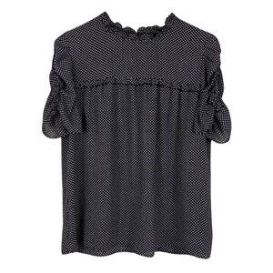 This Who What Wear Black Ruffle Polka Dot Short Sleeved Blouse is in excellent condition!