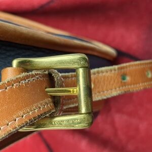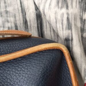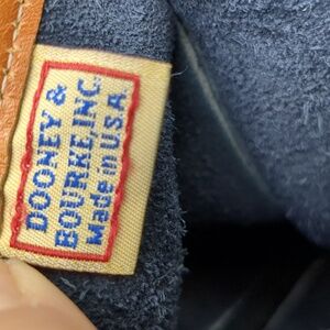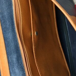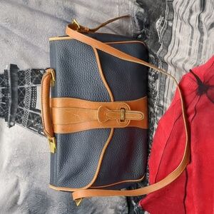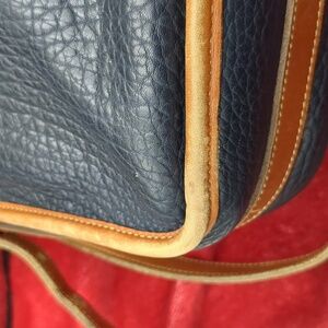 Brown and blue vintage Dooney& Burke Messenger bag. please note there is wear in the corners as well as the handles inside there is some staining at the bottom. this has a zipper pocket as well as an additional pocket for storage. on the outside there is a larger pocket that is the length of the bag. This is dated about 1993. This does show signs of wear but in overall good used condition. approximate dimensions are 17 in across 10 and 1/2 in tall. 3 in deep. please review pics and ask questions prior to purchase
