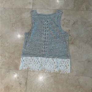 Generation Love gray linen tank white lace trim, back tie up detail small