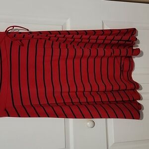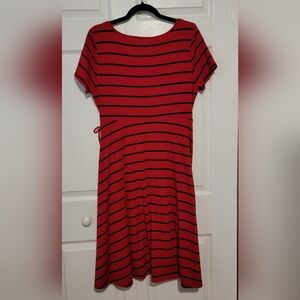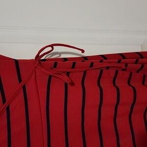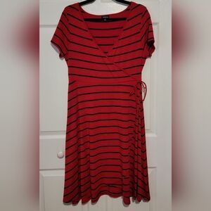 Offered is a fantastic red & navy stripe faux wrap skater dress. Ultra soft stretch material with string bow at waist. Size 0. Made by Torrid. Worn once, bag washed on delicate and hung to dry. Excellent condition. Sized out before I could enjoy. Perfect classic look paired with a light denim jacket and brown boots.