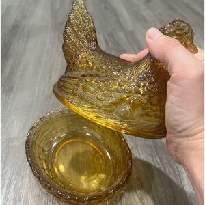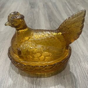 Vintage amber glass nesting hen. The chicken opens so that it can be used as a dish. Perfect for any farmhouse - country kitchen decor or home decorations!