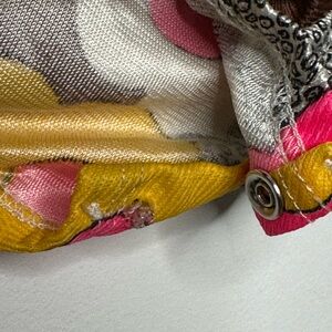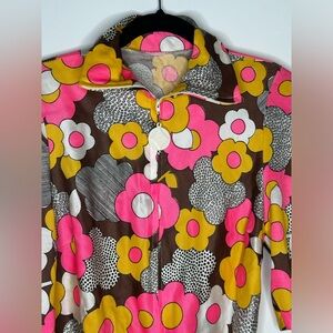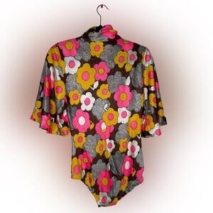 Ultra fun bodysuit in acrylic/nylon blend! The print is an outta control graphic, pop art floral! Bodysuit has a snap crotch (missing a clasp see picture) and long front zipper with a huge plastic pull. Turtleneck with flared sleeves.