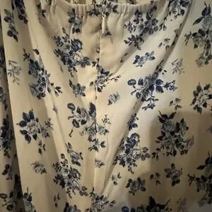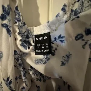 Shein XL A line dress. The sleeves are off the shoulder and the dress has a tieback halter component to it. This is a beautiful, beautiful romantic blue flowered dress on a white background. Expect this to be ankle length. Only worn one time.