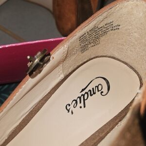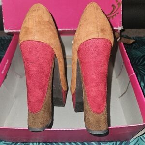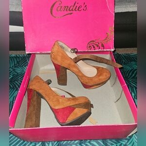 Candie's woman's platform heel. Style Cajudemulti. The heel is 5 1/4 inches and the platform is 1.5 inches. closed toe with an ankle strap. They are light brown, dark brown and a red marroon color. the ankle strap is the dark brown color. I have worn these shoes one time and have just never worn them again. they are super cute but past my 5 inch heel years lol.
