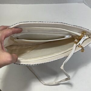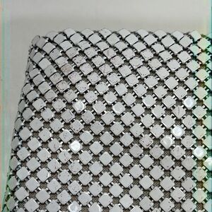 White metal mesh bag. Inspired by Vintage design. Detachable shoulder strap. Can be used as hand bag with dual ring handles in a gold toned hardware or as a clutch with handles down. Zipper closure. Good used condition. White mesh has some scratches, please see photos.