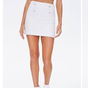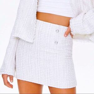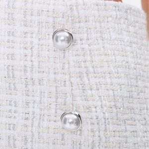 New condition and gorgeous mini skirt! A tweed mini featuring an allover plaid pattern, double breasted design, faux pearl button embellishments, and a concealed back zipper.